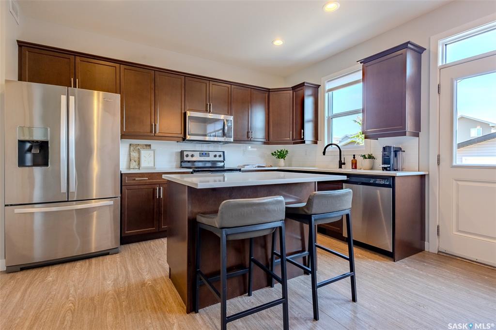 Welcome to 1050 Kolynchuk Crescent in the desirable Stonebridge neighborhood! Step inside to 9’ ceilings and a welcoming living room accented with a stylish board and batten feature wall, along with a conveniently located half bath. At the back of the home, the kitchen overlooks the backyard and offers quartz countertops, a tile backsplash, pantry, eat-up island, double undermount sink, built-in dishwasher, and microwave hood fan. A bright dining nook with custom bench seating completes the main floor. Upst...