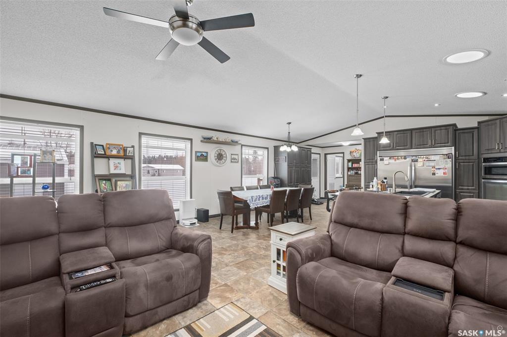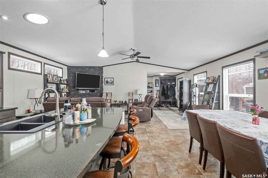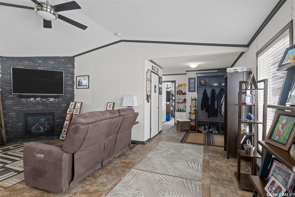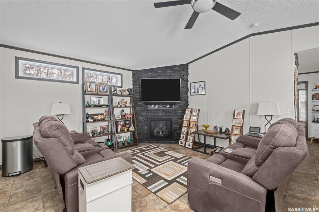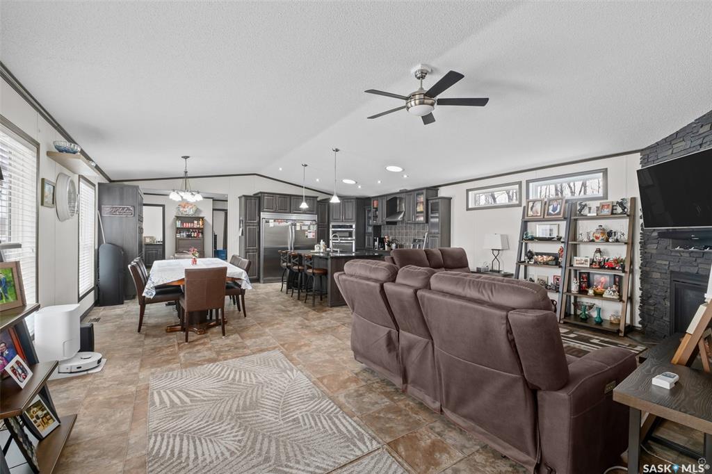 Exceptional 2016 built 3 bedroom and 2 bathroom premier show model manufactured home offering spacious design, quality finishes and small town living just minutes from the city. The open concept main living area is bright and beautifully laid out with vaulted ceilings, an abundance of windows and stylish pot lighting that enhances the modern feel throughout. The living room features a cozy gas fireplace with a dark grey stone surround and the dining area offers plenty of space for a large table. The kitchen...