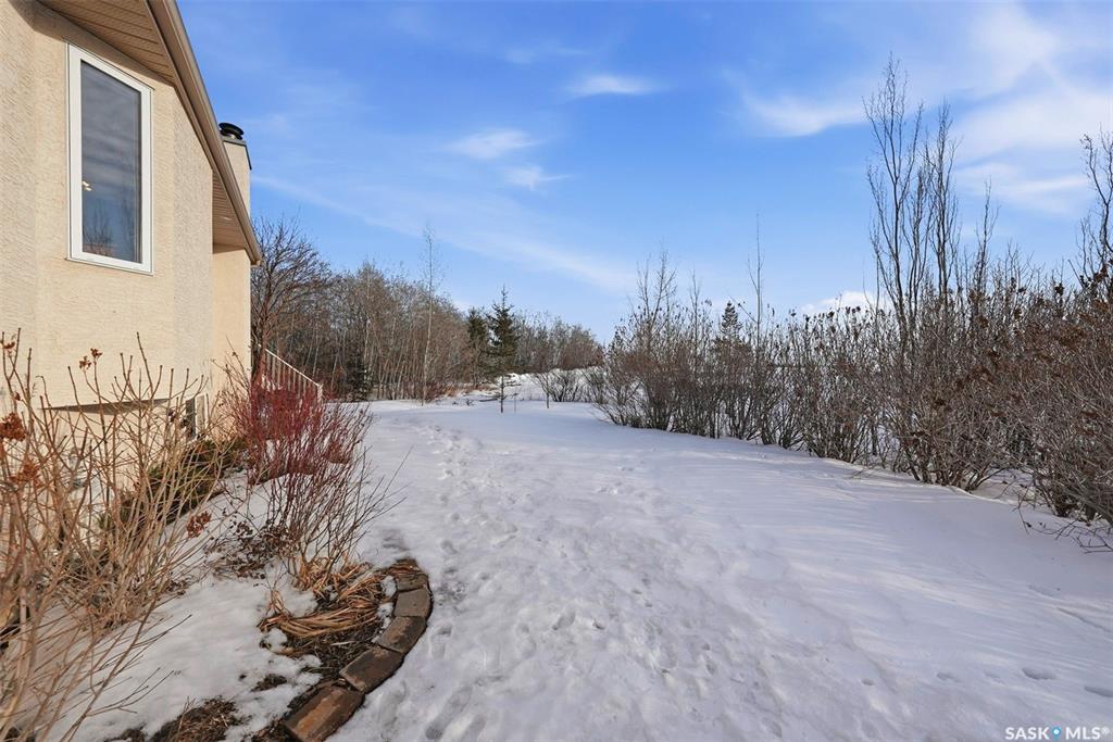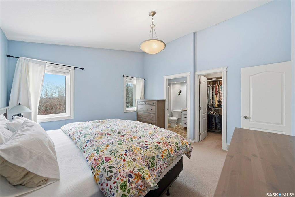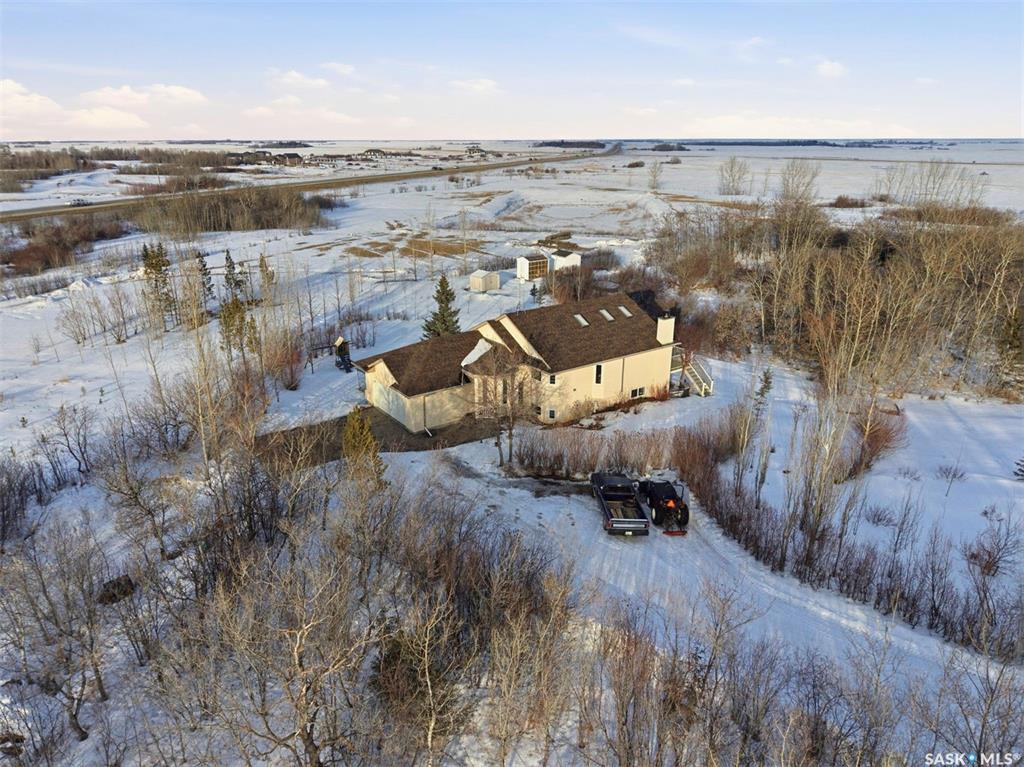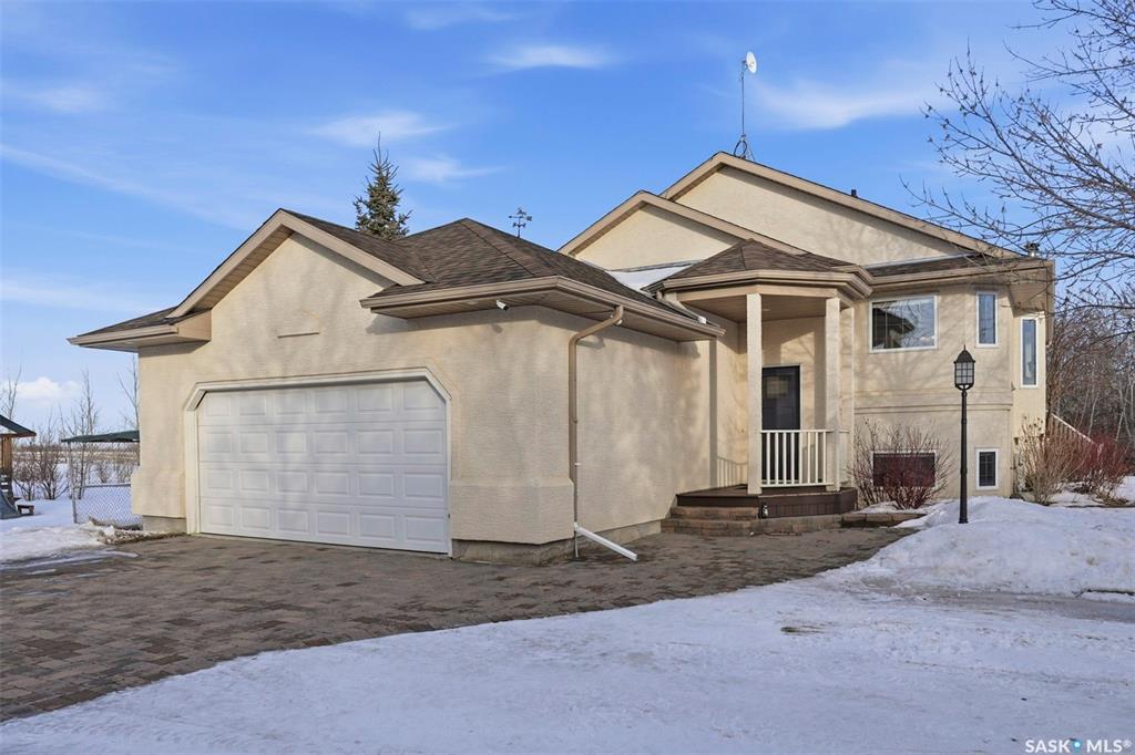 Rare opportunity to own a 14-acre acreage just 10 minutes from Saskatoon city limits. The perfect blend of privacy, efficiency, low utility costs and future potential. Built in 2005 by Ehrenburg, this quality home offers nearly 2,400 sq ft of fully finished well laid out living space. The layout is functional and inviting, with loads of natural light & numerous recent upgrades including new shingles (2023), professionally renovated bathroom (2021), updated flooring (2021), and a patio stone paved drivewa...